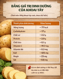 Bên cạnh đó, khoai tây chứa kali và vitamin B6, hỗ trợ hoạt động của tim mạch, hệ thần kinh và quá trình phát triển não bộ. Đây là những dưỡng chất cần thiết cho cả mẹ và bé trong sinh hoạt hằng ngày.
